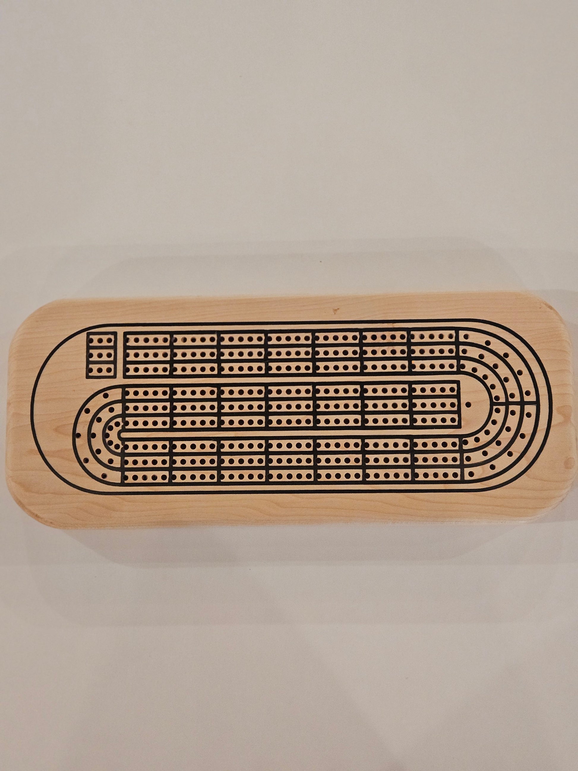 Three player Cribbage Board made from various hardwoods with resin inlay, Comes with 9 pegs, a deck of cards, and peg storage on backside. Measures 12" x 5" x ~3/4"